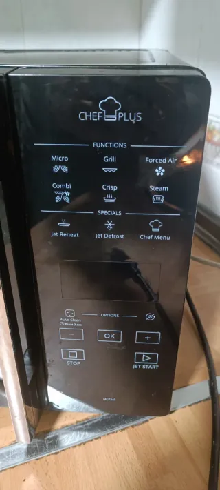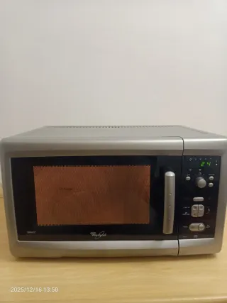 Microondas Whirlpool Chef Plus MCP 349/1 25 litros con Grill y con tecnología Dual Crisp. 800W - Funciones: Micro, Grill, Forced Air, Combi, Crisp, Steam cocción al vapor - Especiales: Jet Reheat, Jet Defrost, Chef Menu. - Panel de control con botones OK, STOP y JET START.viene con vaporera, rejillas, plato crispi. Esta en muy bien estado lo he usado muy pocas veces y funciona de maravilla lo único la bombilla de luz de dentro a veces se apaga y se vuelve a encender por lo demás hace unos platos buenísimos.