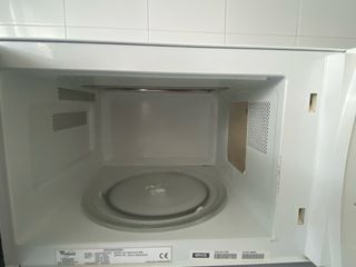 Microondas Whirlpool en color blanco. Cuenta con un diseño moderno y compacto. Es un diseño sin plato, lo que lo hace más cómodo y limpio. En funcionamiento hasta hoy. Se vende por reforma íntegra de la cocina.