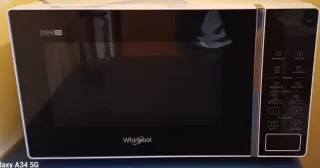 Microondas Whirlpool en buen estado, con función grill. - Modelo: COOK 20 - Funciones: Microwave, Defrost, Grill, Combi Grill, Keep Warm, Soft/Melt, Auto Cook, Auto Clean. - Panel de control digital con pantalla. - Diseño moderno en color blanco y negro.