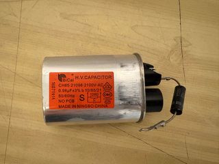Condensador de alto voltaje (H.V. Capacitor) de la marca BiCai. - Modelo: CH85-21098-2100V-AC - Capacidad: 0.98µF ±3% - Tensión: 2100V AC - Frecuencia: 50/60Hz - Fabricado en Ningbo, China.