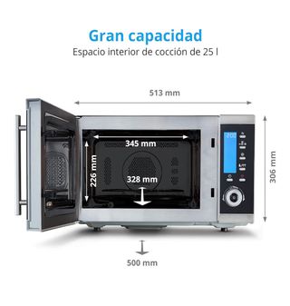 Microondas Taurus con función grill. - Diseño moderno en acero inoxidable. - Panel de control con mandos giratorios. - Puerta con ventana para visualizar el interior.