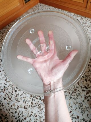 Plato para microondas de gran tamaño, con un diámetro de 34 cm. Se encuentra en perfecto estado, como nuevo. - Diámetro: 34 cm - Material: Vidrio - Color: Transparente