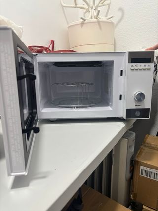 Buena oportunidad si necesitas un microodas. Lo vendo porque cambio los muebles de la cocina y el que voy a poner es integrado. Si no lo vendo por aquí, iré a una tienda de segunda mano. Está como nuevo, muy bien cuidado. Su precio original son 159€, lo dejo por 60€, menos de la mitad, podéis buscarlo en tiendas online (última foto de mediamark). ́ Características; ✅ Potencia microondas 800 W (6 niveles) ✅ Grill 1100 W para gratinar y dorar ✅ Interior cerámico antibacterias, fácil de limpiar ✅ 16 programas automáticos + modo ECO para ahorrar energía ✅ Plato giratorio 28,8 cm y bloqueo infantil De verdad, merece la pena.