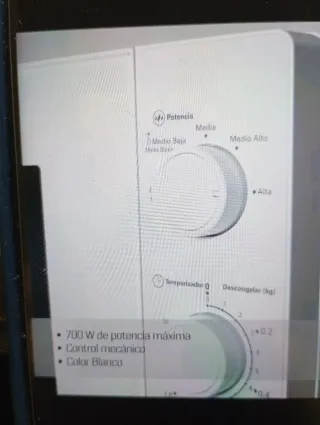 Microondas blanco de la marca Orbegozo. Funciona perfectamente. Lo vendo barato por traslado urgente y donde voy no me lo puedo llevar. - Panel de control con dos mandos giratorios.