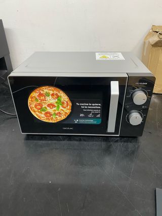 Microondas Cecotec ProClean 3010 en color negro y plata. Cuenta con una capacidad de 20 litros y una potencia de 700W. - Tecnología 3DWave para una cocción uniforme. - Función Ready2Clean para una fácil limpieza. - 5 niveles de potencia. - 6 programas automáticos.