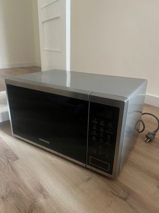 Microondas Samsung en color gris. Modelo MG23J5133AT. Apenas utilizado. En su caja original con las protecciones y el plato interior. - Diseño moderno y elegante. - Panel de control digital con muchísimas opciones de cocinado. - Acabado metálico. 27.50 x 48.90 x 37.40 Capacidad: 23l Potencia Microondas: 800 W Número de Niveles de Potencia: 6 Tipo de Microondas: Con grill Potencia Grill: 1.100 W