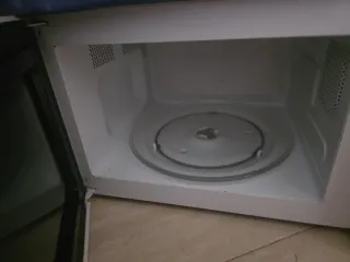 Potencia 700W. Usado, pero funciona correctamente. El plato giratorio interior de cristal tiene un borde mellado, pero no afecta a su funcionamiento. - Modelo antiguo de LG. - Funciones de microondas y grill. - Controles giratorios para potencia y tiempo.
