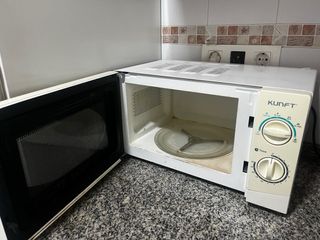 Microondas de color blanco, marca Kunft. Cuenta con diferentes niveles de potencia y función de descongelación. - Selector de potencia: Descongelar, Bajo, Medio-Bajo, Medio, Medio-Alto, Alto. - Temporizador con selector giratorio.