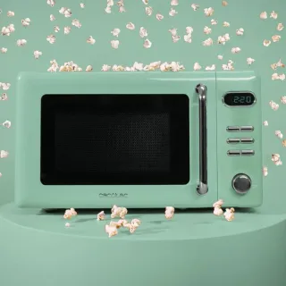 Microondas de diseño en color verde agua con detalles en madera. - Puerta con acabado espejo. - Panel de control digital. - Botón giratorio para ajustes.