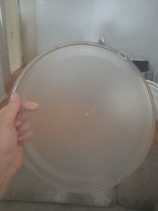 Plato de cristal para microondas con soporte giratorio. En perfecto estado. SIN MELLAS NI ESCONCHONES. Diámetro de 32 cm. Puede verse en las fotos. C2