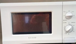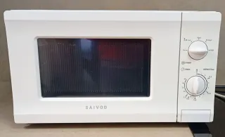 Microondas de la marca SAIVOD en color blanco. Cuenta con dos mandos giratorios para ajustar la potencia y el tiempo. - Mando de potencia con niveles: Low, M.Low, Med, M.High, High. - Mando de temporizador y descongelación con diferentes niveles. Tiene su tiempo pero es que apenas se utiliza.