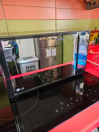 Microondas LG con acabado en negro y detalles rojos. - Diseño moderno y elegante. - Panel de control táctil. - Puerta con gran espejo.