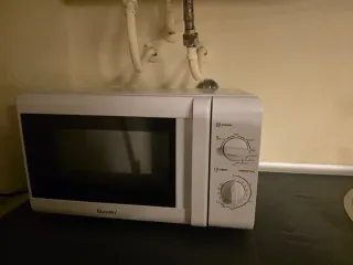 Microondas de color blanco de la marca Bluesky. Un electrodoméstico práctico para tu cocina. - Diseño compacto. - Panel de control con diales para potencia y tiempo. Tiene menos de un año, se ha usado en una segunda residencia