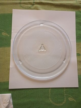 Plato de cristal para microondas. Diseñado para adaptarse a la mayoría de los modelos. - Material: Vidrio resistente. - Diámetro aproximado: [Insertar diámetro si se conoce]. - Conexión central con tres puntos de apoyo.