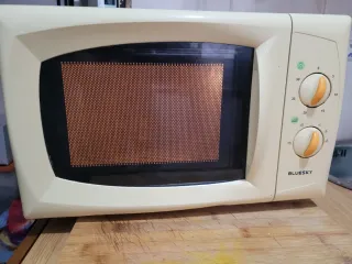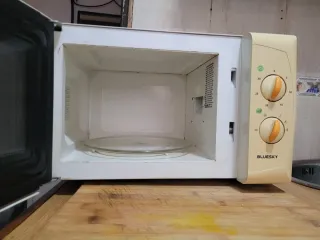 Microondas de la marca Bluesky en color blanco. - Diseño compacto y funcional. - Panel de control con mandos giratorios para potencia y tiempo.