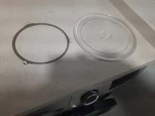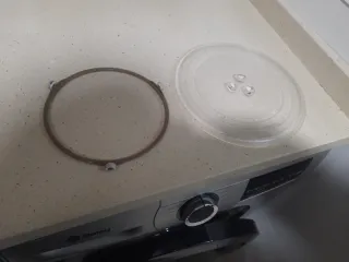 Plato de cristal para microondas junto con su aro giratorio, marca Balay. - Plato de vidrio 24,5 cm. - Aro con ruedas de apoyo 18 cm. - Se hace envío.