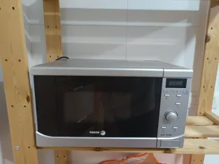 Microondas plateado de la marca Fagor, modelo Pro Sense. Diseño moderno y funcional. - Acabado en color plateado. - Panel de control con pantalla digital. - Botón giratorio para ajuste de tiempo y potencia.