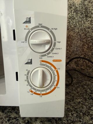 Vendo temporizador para microondas, en buen estado. - Funciona con dos ruedas giratorias. - Permite controlar el tiempo y la potencia. - Incluye diferentes niveles de potencia y descongelación. - Mecanismo de funcionamiento visible en las imágenes. - Modelo: TM30MU01E. Galanz