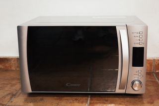Microondas Candy CMG 25GDSS en color plateado. - Diseño moderno y elegante. - Panel de control intuitivo. - Puerta con acabado en cristal negro.