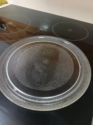 Plato giratorio de cristal para microondas. Diseñado para encajar en la mayoría de los modelos. - Material: Vidrio resistente. - Diámetro 25,5 cm - Incluye anillo giratorio con ruedas. - Tengo dos platos de la misma medida.