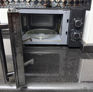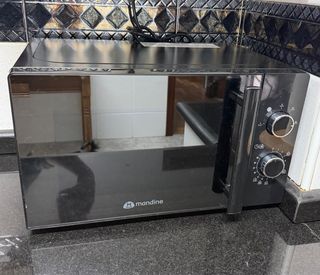 Microondas de la marca Mandine en color negro. - Diseño moderno y elegante. - Acabado brillante. - Panel de control con mandos giratorios. - Tiene marcas de desgaste al abrir la puerta, como se aprecia, pero funciona perfectamente.