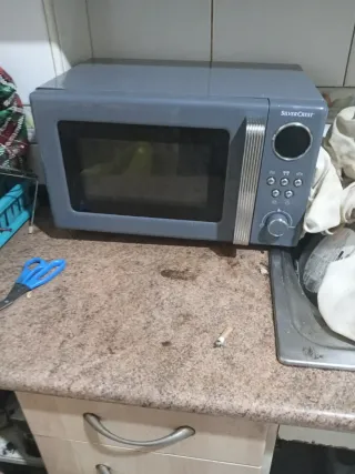 Microondas SilverCrest en color gris, en buen estado. - Diseño moderno. - Panel de control con botones y dial. Le fa Lta el plato de dentro pero está nuevo le falta el plato se trasbio en el traslado pero es semi nuevo disponible 24 horas