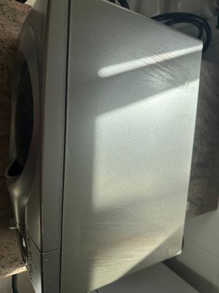Microondas de la marca Samsung en color plateado. Presenta un diseño moderno y funcional para tu cocina. - Acabado exterior en color plateado. - Marca: Samsung. tiene marcas en la parte superior, pero funciona perfectamente solo efectivo