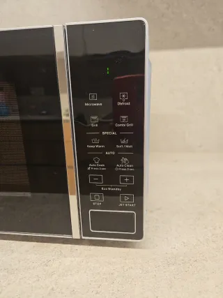 Microondas de la marca EAS ELECTRIC con tecnología Smart Technology. Su diseño es plateado y cuenta con un panel de control digital. - Función Microondas, Grill y Combi. - Temporizador y reloj. - Inicio rápido/+30 segundos.