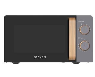 Microondas Becken con un diseño moderno en color negro y detalles en madera. Cuenta con dos mandos giratorios para ajustar la potencia y el tiempo. - Acabado exterior en negro. - Tirador y detalles en madera. - Mandos giratorios para potencia y tiempo.