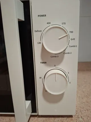 Microondas de la marca Hisense en color blanco. Cuenta con dos mandos giratorios para ajustar la potencia y el tiempo. Limpio y bien cuidado. No se envía.