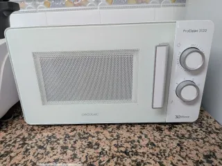 Microondas Cecotec ProClean 3120 de color blanco con una capacidad de 20 litros y función grill. Cuenta con un diseño moderno y elegante. En el lugar donde pasan las ruedas se ha oxidado un poco pero tanto el microondas como el grill funcionan perfectamente. - Capacidad: 20 litros. - Función grill. - Diseño moderno.