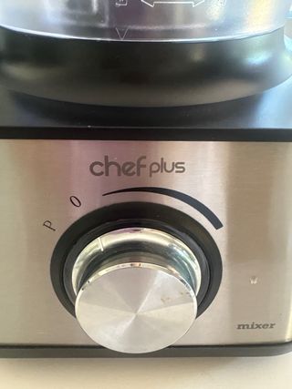 Robot de cocina Chefplus con diseño moderno y acabado en acero inoxidable. - Tapa transparente con asa. - Dial de control con varias velocidades y función P (Pulse). - Indicaciones de volumen en el bol (hasta 1200 ml).