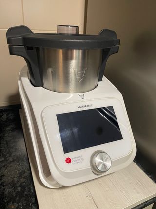 Robot de cocina Monsieur Cuisine Connect de Silvercrest (cuece, sofríe, cuece al vapor, mezcla, bate y amasa, pica, tritura, emulsiona y pesa) Un ayudante versátil para tu cocina. - Capacidad de 3L - Potencia máxima de 1200W - Diseño moderno en color blanco. - Pantalla táctil integrada de 17,78cm - Dial giratorio para ajustes.