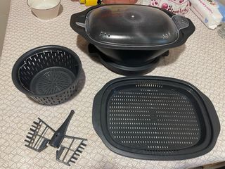 Olla grill eléctrica Saladmaster de titanio. Se usa como horno, sarten y para guisos. Ideal para arroces, panes, pizzas. Sello ecológico Retención promedio 93% nutrientes Control de temperatura Sistema clean& easy Solo la hemos usafo una vez