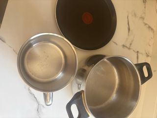 Set de utensilios de cocina de acero inoxidable. No para inducción - Sartén antiadherente. - Olla con asas. - Cazo.