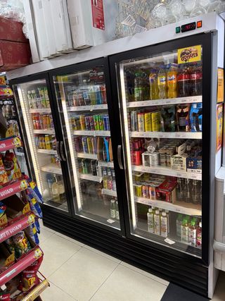 Nevera expositora de la marca Docriluc, ideal para mantener bebidas y alimentos frescos. - Diseño con puertas de cristal. - Iluminación interior. - Estructura blanca.