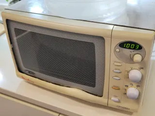 Microondas Moulinex en color crema, modelo Optigrill Compact. - Panel de control con botones y diales. - Asa para apertura de puerta. - Panel frontal de la puerta ligeramente separado, necesario volver a atornillar. No impide funcionamiento correcto del microondas ya que el interior está sellado.