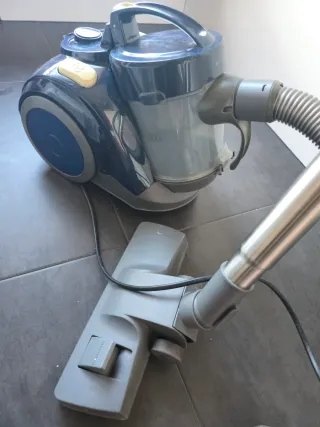 Aspirador escoba de diseño moderno en tonos grises y azules. - Incluye accesorios. - Batería recargable. La batería habría que cambiar no carga. Si, alguien es manita u la puede arreglar o comprar una el aspirador está perfecto estado.