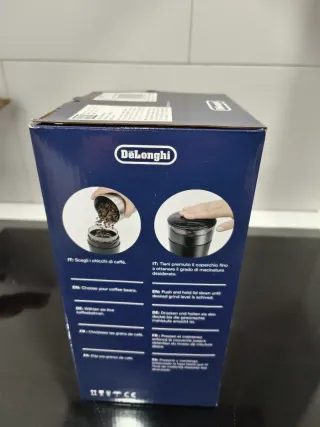 Molinillo de café eléctrico de la marca Delonghi en color negro. Su diseño es compacto y moderno. - Tapa transparente para ver el molido. - Base con el logo de Delonghi.