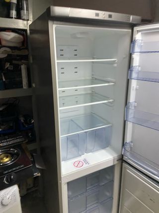 Nevera combi de la marca BRU, PARA REPARAR. - Dos puertas con tiradores integrados. - Panel de control digital en la parte superior. Gomas y todo en general en buen estado. El problema no es el gas porque da un fallo esporádico y luego vuelve a funcionar. La nevera deja de enfriar y lo mas probable es que le falle la placa electrónica de la puerta, porque ya un botón no da señal al tocar. Para reparar o despiece. Está en una 4ª planta sin ascensor y ayudo a bajarla. Tengo carretilla. NO ENVÍO.