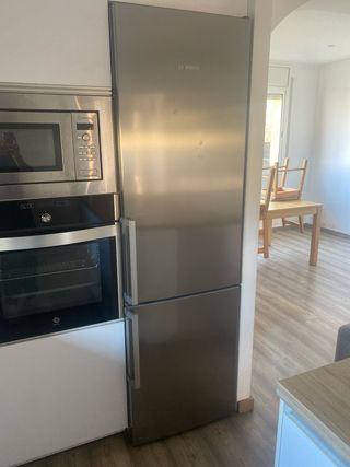 Nevera de la marca Bosch con acabado en acero inoxidable. Diseño moderno y elegante. - Acabado en acero inoxidable. - Puertas con tiradores integrados.