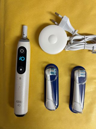 Cepillo de dientes eléctrico Oral-B iO 10 con cargador y dos cabezales. EN PERFECTO ESTADO - Mango de cepillo de dientes iO 10. - Base de carga. (NO ORIGINAL) - Dos cabezales de repuesto.