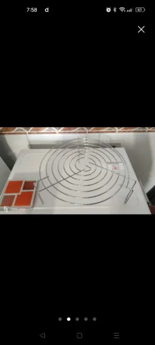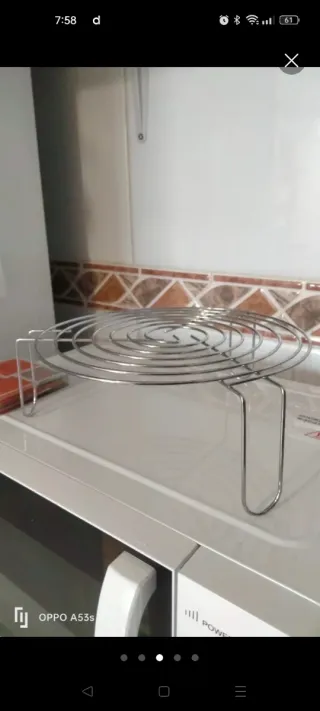 Rejilla metálica circular para microondas. Es un accesorio útil para cocinar o calentar alimentos. - Material: Metal. - Diseño: Circular con patas. Perfecto estado