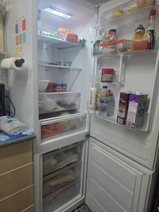 Nevera blanca con estantes interiores y compartimentos en la puerta. Tiene 2 puertas. La parte de arriba es congelador . Y la de abajo frigorífico . - Estantes de cristal. - Cajones transparentes. - Compartimentos en la puerta.