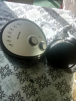 Freidora de aire marca Salter en color negro y plateado. Cuenta con dos diales para controlar la temperatura y el tiempo. - Indicaciones de temperatura y alimentos en la parte superior. - Cesta extraíble para facilitar la limpieza. Es de 3.2 litros . Venta en persona. Está nueva es un chollazo.