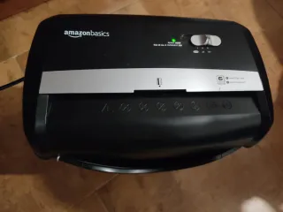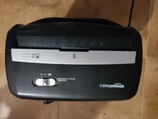 Trituradora de papel marca AmazonBasics en color negro. - Capacidad para 6 hojas. - Función de retroceso (REV). - Indicador de listo (READY). - Indicador de sobrecalentamiento (OVERHEAT).