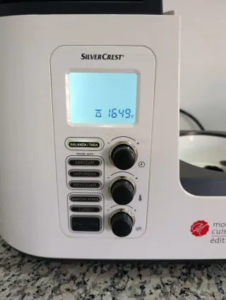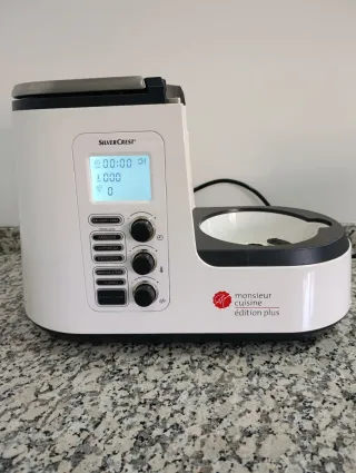Base motor para Monsieur Cuisine Edition Plus. Con el cable y la flor. Funciona todo, calentar y los programas predeterminados, pero la rosca del tiempo a veces hace el tonto y no suma. El embellecedor de la base está un poco dañada (vean fotos), pero no sfecta para nada sl funcionamiento, es solo el embellecedor. NI VASO, NI ACCESORIOS.