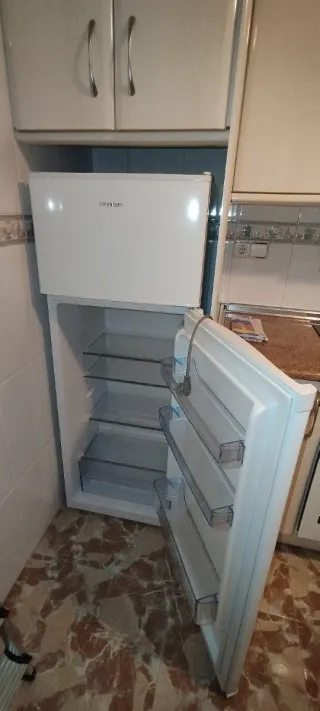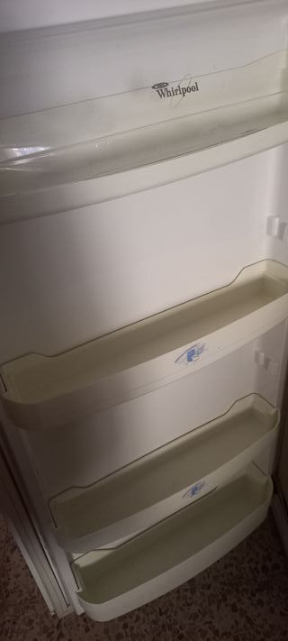 Frigorífico de color blanco, con estantes interiores. No funciona esta para arreglar pero está impecable por dentro y por fuera, puerta , bisagras... - Estantes de rejilla. - Bandeja azul. - Puerta con bisagras.