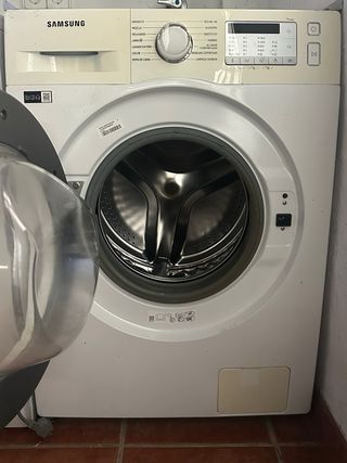 Lavadora de carga frontal Samsung. - Color blanco. - Panel de control con programas. - Puerta redonda. - Compartimento para detergente.