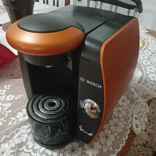 Cafetera de cápsulas de la marca Bosch en color naranja y negro. Diseñada para preparar tu café de forma rápida y sencilla. - Diseño moderno en naranja y negro. - Marca: Bosch.